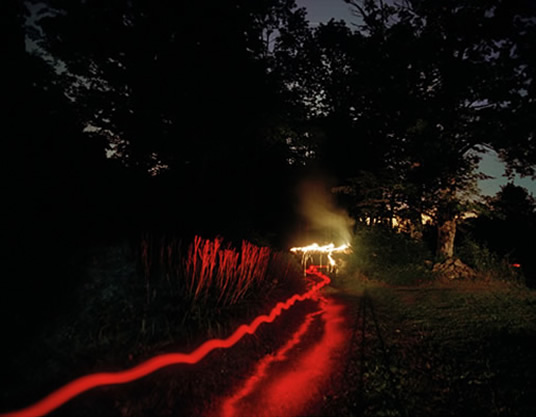 For over a dozen years I have gone to a place in Southern New Hampshire, in August and photographed the night. Beginning around 10pm the stars appeared: thousands of them- a sight so enchanting I stand there in silent awe. These are long exposures, 45 minutes to an hour and strange things happen: mists come and cover the lens, stars streak and moons rise and fall. No ambient light intrudes other than my flashlight or the occasional house lights. More recently I've gone to the Southwest where the night sky is too brilliant to imagine. Amoung the great rocks and giant saguaros, another kind of magic takes hold and once more, my handheld flash lights shape the image.