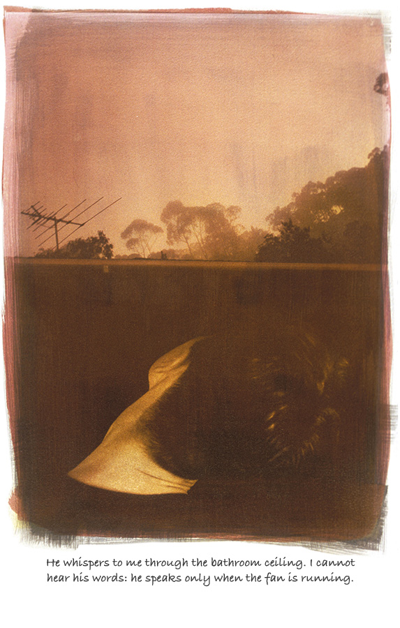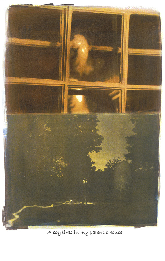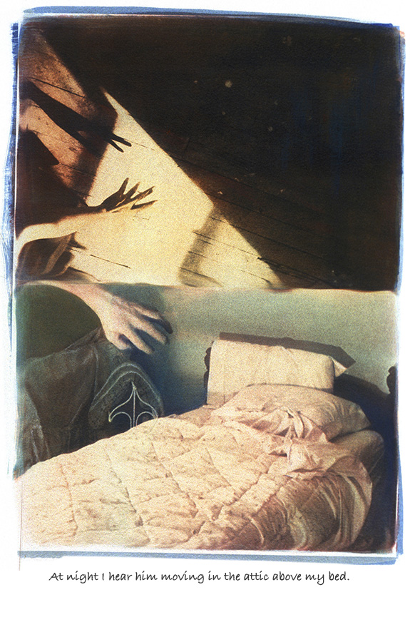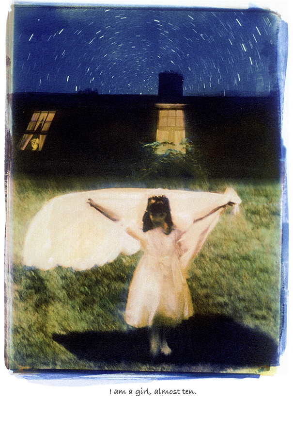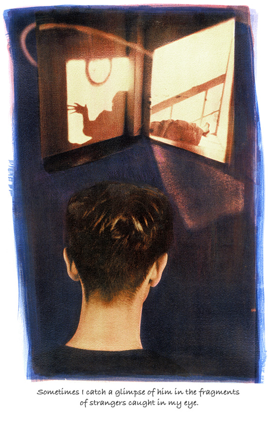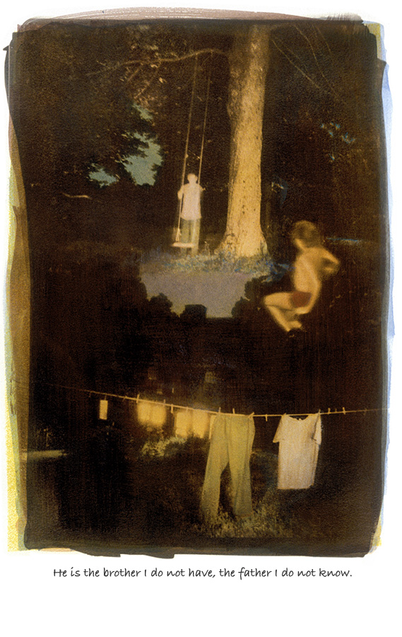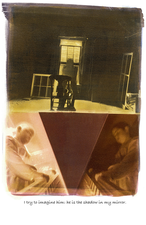 When I was a small girl, I imagined that my perfect “other”, my doppelganger perfect friend, lived in my house. I could speak to him, play with him, but never see him. As I grew older, he became the perfect father, the perfect boyfriend. As I entered puberty, I began to fear that I would never meet him and if I did, how that would change my life. This is a story about that transitional period in childhood when gender moves from a reflection of self to the “other”. It is also a reflection of that childhood, a place in time fixed in snapshots of memory: a meld of images from family albums to moments half-remembered, half-constructed.This work was done in gum bichromate photograph on watercolor paper.
