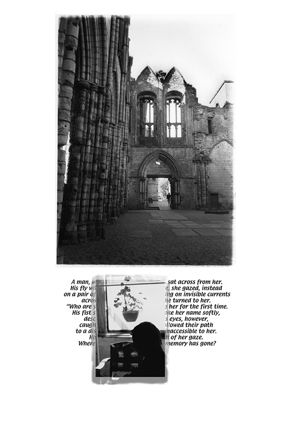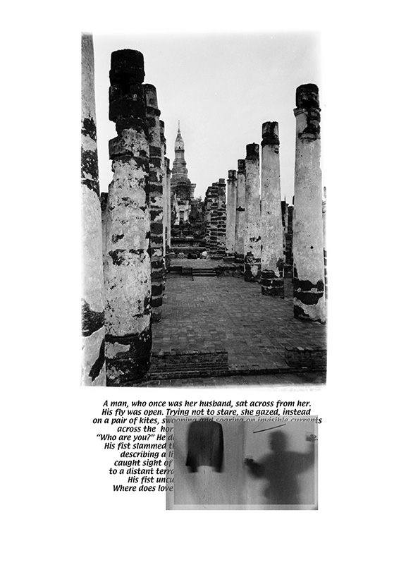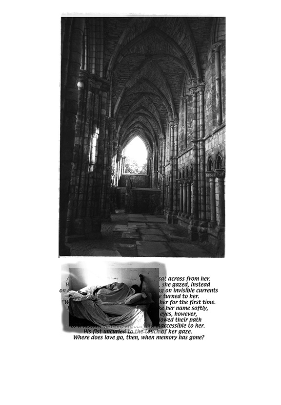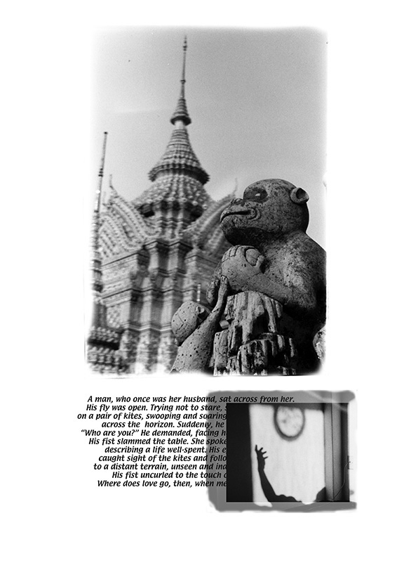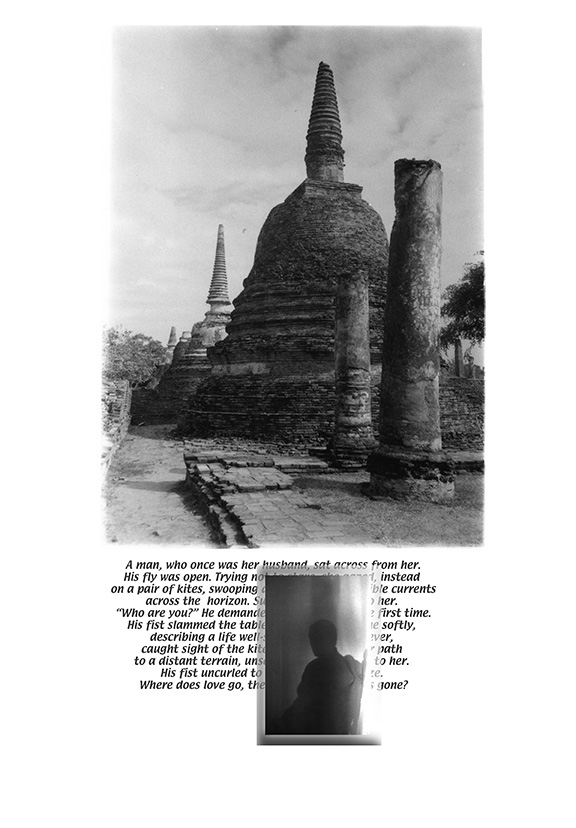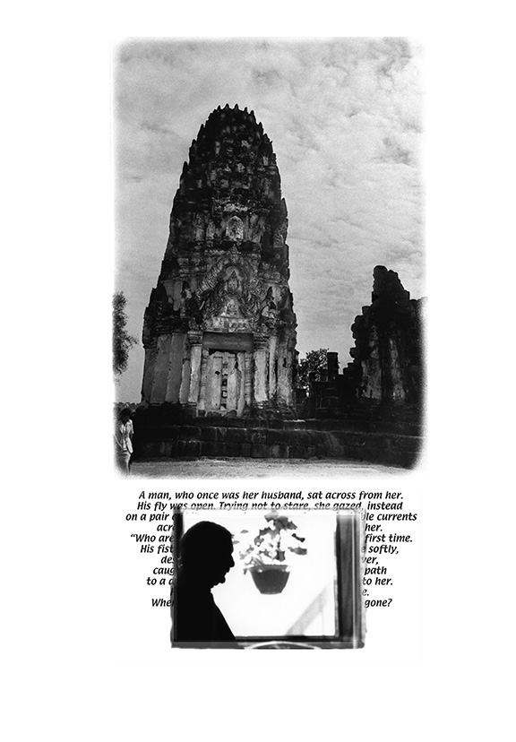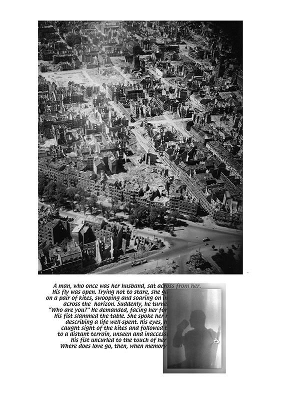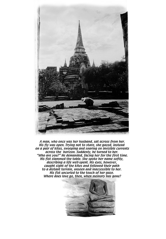 "Crows in the Attic, Plucking Memory" grew from that experience. As the images move around the text, they disclose or hide the words, just as the words and images seem to jumble in my father's mind. The images are photographs I have taken of ruins, mostly in Scotland and Thailand with the exception of the photograph of Stuttgart,Germany, taken in 1945, by my Uncle Bill. He is my father's youngest sibling. All of his brothers and sister have died or shown signs of this disease. So far, he is as lively and witty as ever. He has written his memoirs and labeled his photographs. We are all hoping for a cure to this dreadful disease.